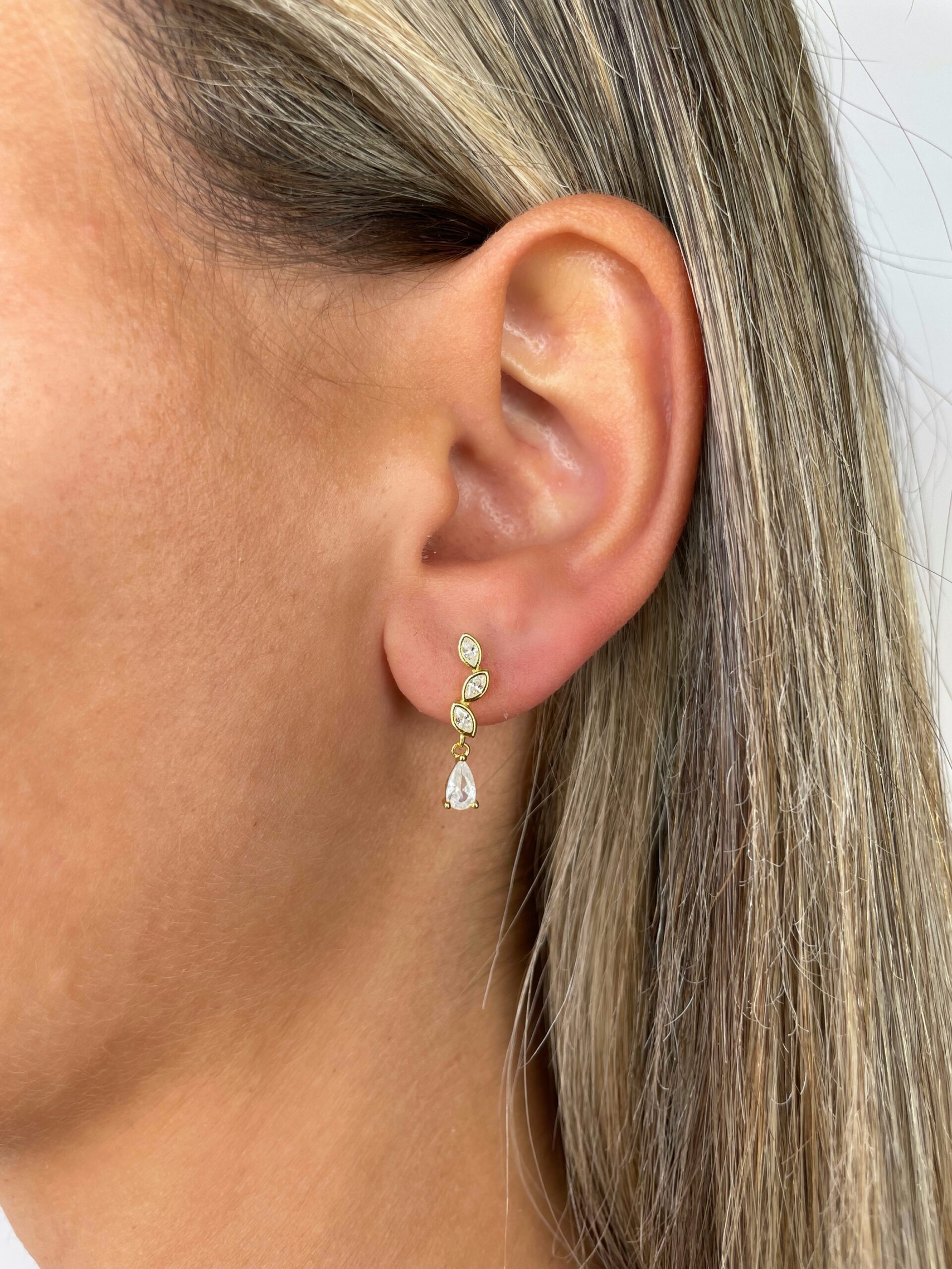 זוג עגילים בעיצוב יוקרתי וייחודי בסגנון תליון נופל עשויים זהב 14K משובצים יהלומים בחיתוך מרקיזה בתוספת יהלום נופל בחיתוך טיפה במשקל כולל של 0.45 קראט כל עגיל
