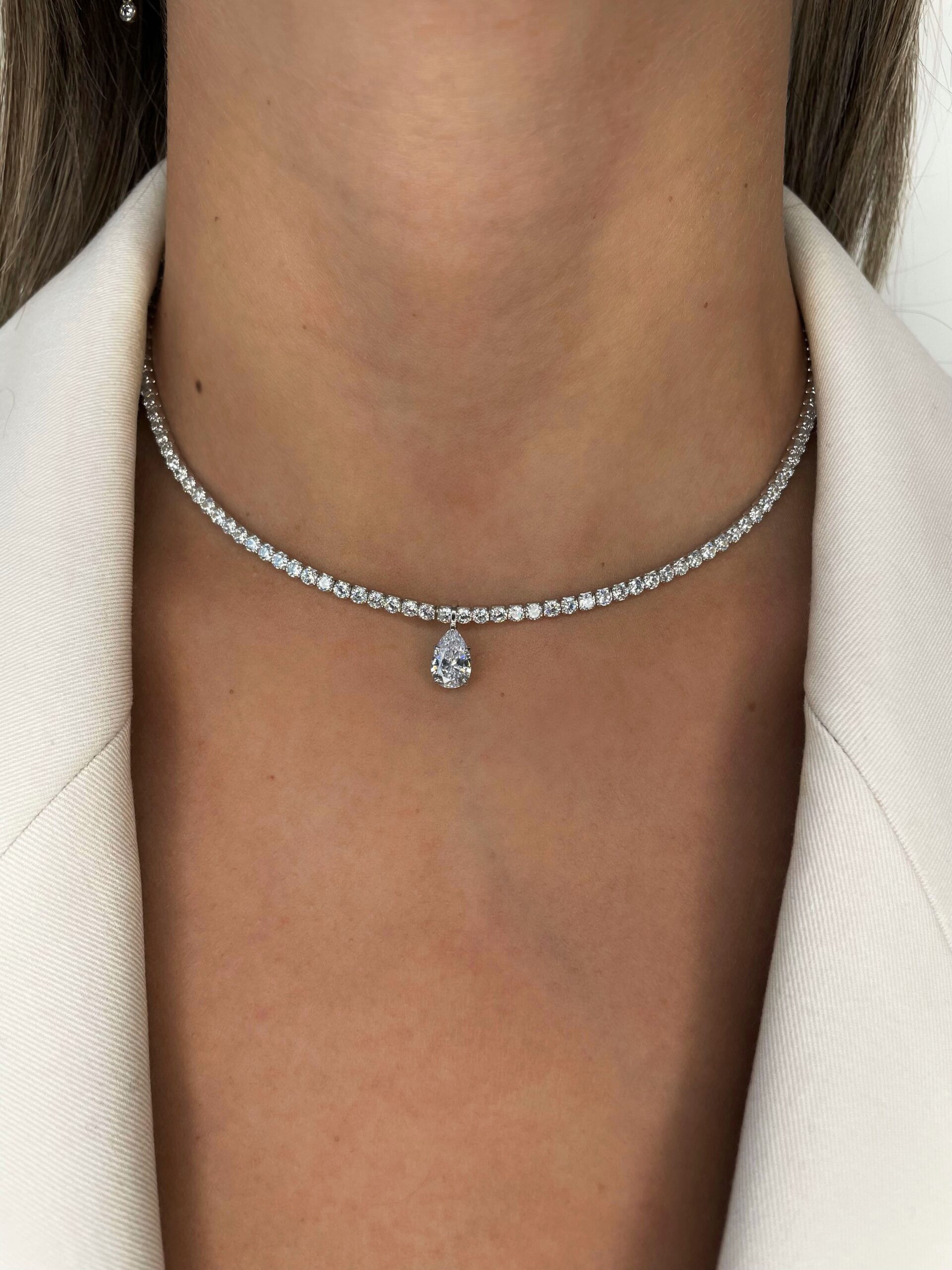 קולייר טניס מלא עשוי כולו זהב 14K משובץ כולו יהלומים במשקל כולל של 5.5 קראט  בשיבוץ יוקרתי בתוספת יהלום מרכזי בחיתוך טיפה במשקל 1 קראט